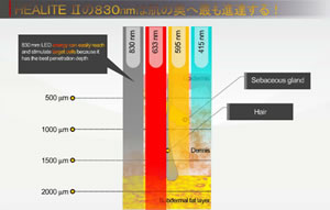 ヒーライト ヒーライトは、830nmという近赤外線の波長を使い、損傷した細胞の早期の治癒や、細胞・器官の機能改善、細胞の増殖を促します。 つまり、コラーゲンの生成や肌のターンオーバーの促進、創傷治癒促進、ニキビ菌の殺菌などの効果があります。 830nmという近赤外線の波長は、最も皮膚への到達度が高い為、筋肉層にまで到達するのが最大の特徴です。 ゆえに、これまでのLEDでは難しかったしわやたるみにも有効です。 さらに、ヒーライトは1,800個のLEDを搭載しているため、密にお肌に光エネルギーを届けることができます。 ヒーライトの最大の特徴は590nmと830nm、2つの異なる波長がシナジー効果で連射されることです。 590nmは830nm照射の前に1分間プレ照射されます。590nmは角質細胞間の隙間を緩ませて、830nmが透過しやすくなる効果があります。つまり、590nmは830nmが最大の効果を発揮できるような環境を作り出してくれるのです。 ヒーライトは、わずかな赤みが生じる方もいますが、施術中・施術後の痛みやダウンタイムがありません。 抗炎症効果 炎症をおさえる(赤みの軽減) 血行促進 血液流れをよくする(目のクマやくすみ肌も改善) 鎮痛効果 痛みやヒリつきをおさえる(ピーリングや吸引・レーザーのヒリつきの軽減) 創傷治癒促進 傷の治りを速める(レーザーや手術後に有効) 筋繊維芽細胞の活性作用 筋繊維を太く、密度の高いものへ変えていく(肌のハリ改善) ヒーライトの説明動画 ピーリングや一般的なスキンケアの後に赤みの抑制、創傷治癒の促進することができます。 詳細はこちらから 治療時間 15分程度 治療直後の状態 わずかな赤みが生じる方もいますが、基本ダウンタイムなし 回復期間 ほぼ日常生活に支障なし 治療間隔・回数 気になった時に随時行うことが可能(目的に応じて) 治療費 ¥3,300(税込)/1回 補足 治療直後より化粧可能 他の施術との併用可能 効果には個人差ありますので、診察時にご確認ください