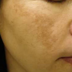 QスイッチYAGレーザー QスイッチYAGレーザーでは、2つの波長を使い分けて、色素病変の治療をすることが可能です。シミ・そばかすといった皮膚の浅い層にあれば532mmの波長を、あざや刺青など深部にまで到達しているものには、1064nmの波長を使用します。 一般的にレーザー治療が禁忌とされていた肝斑に対しても、皮膚へのダメージを最小限に抑えつつメラニンのみを選択的に加熱する「レーザートーニング」と、エネルギーの均一照射を可能にする「フラットパルステクノロジー」の導入により、安全で効果的な治療が可能となりました。 治療時間 数分〜15分程度 治療直後の状態 治療箇所の色調が変化し、数日後に若干のかさぶた様の薄皮が出来る。 肝斑の治療はわずかな赤みのみ 回復期間 5〜7日。肝斑の治療はダウンタイムなし。 治療費 シミ(1cm×1cm) ¥18,700(税込) 肝斑レーザートーニング ¥17,600(税込)/1回 補足 ⚫︎シミ・あざの施術後は、治療部位に3〜7日間保護剤(創傷被覆剤:¥1,100・軟膏:¥990〜)などを使用していただきます。 ⚫︎後天性真皮メラノサイトーシス・太田母斑・外傷性刺青に対しては保険適応となります。 ⚫︎肝斑治療であるレーザートーニングは2週間に1回程度、5〜10回の治療が必要となります。 老人性色素斑 治療前 治療後(上方のみ治療) 肝斑 治療前 治療後(7回施術)